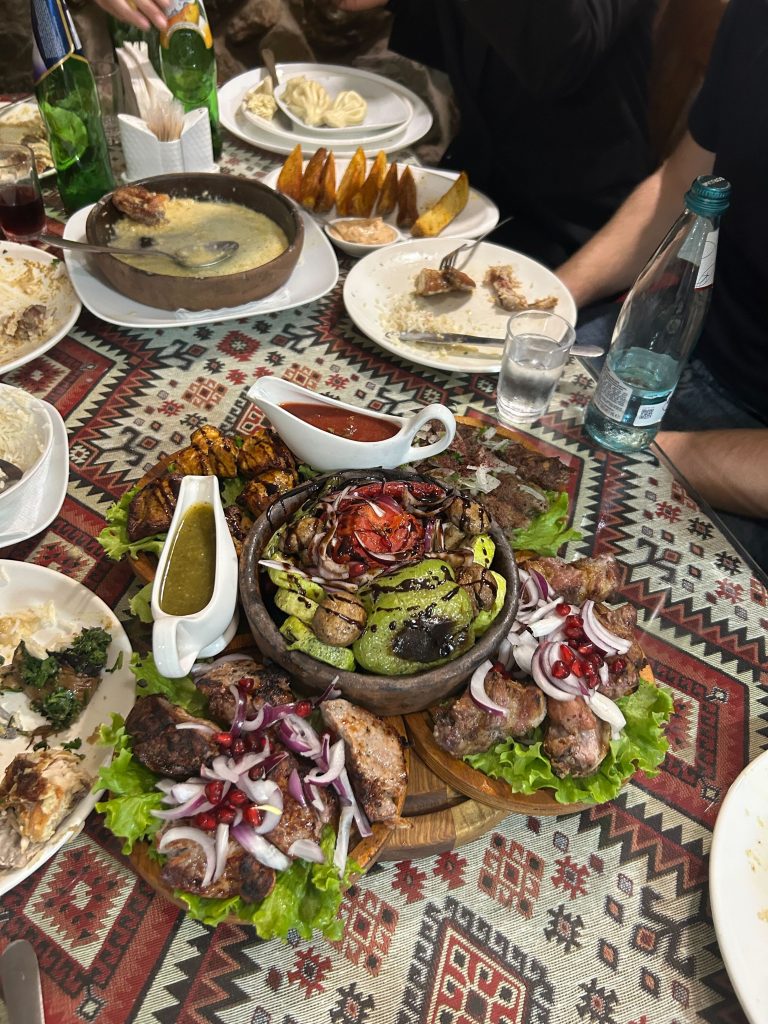 That evening, we gathered for a traditional Georgian dinner, sharing a variety of dishes family-style. From khachapuri (cheese-filled bread) to khinkali (dumplings) and hearty stews, the food was an absolute highlight. Georgian cuisine did not disappoint, and we all agreed that it was one of the best